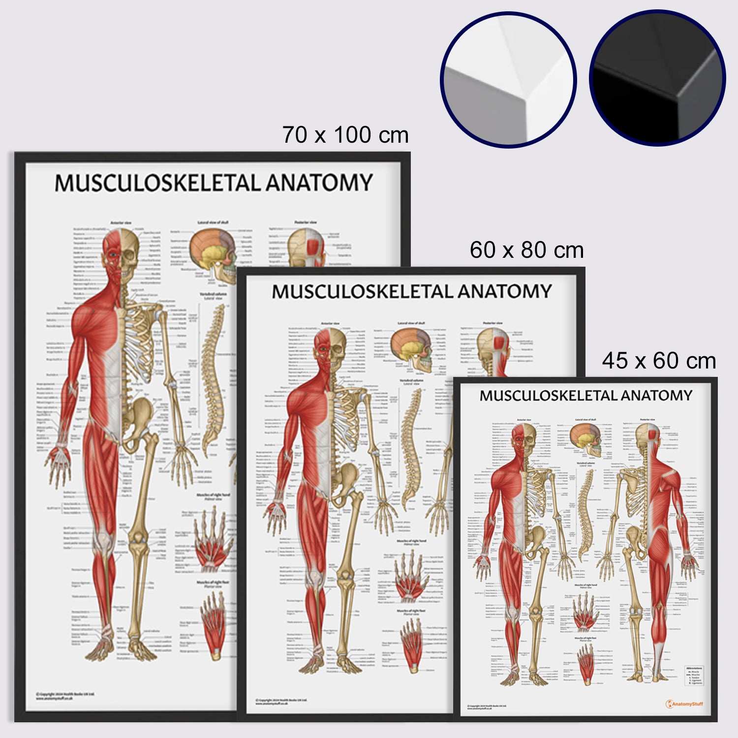 All of our educational prints - whether anatomy, veterinary, or health-focussed - are available with framed options in black or white and come in a range of sizes to suit any space. Each frame is designed to highlight the vibrant, professional quality of our prints.